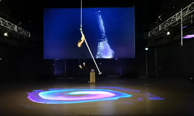 Le mât pendulaire devient une horloge vivante. Équipé de capteurs gyroscopiques et suivi par des caméras de profondeur, son mouvement déclenche un mapping visuel au sol et en arrière-plan, accompagné d’un son spatialisé dans l’espace. Morgane, manipule le mât et réalise des figures aériennes ; chaque oscillation transforme lumière et son, comme si le temps lui-même basculait avec elle.